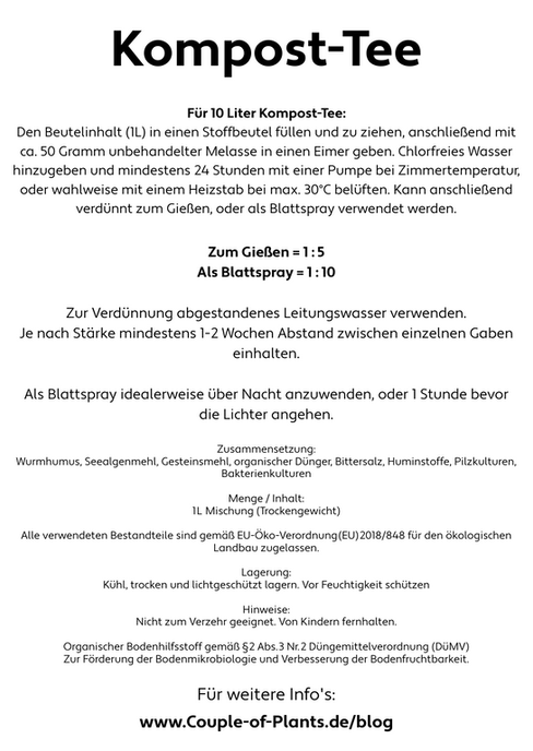 1 Liter ergibt bis zu 60 Liter verdünnten, fertigen Kompost-Tee zum Gießen.